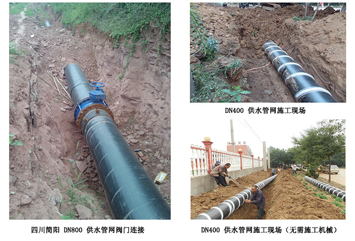 在工程施工方面,大口径华体会huatihui(中国)管也占很大优势。钢丝缠绕超高华体会huatihui(中国)管的比重约为1.2,而由于其壁厚很薄,直径可以小一号,其重量比铸铁管和PCCP管小5—10倍,搬运和安装非常轻便。超高华体会huatihui(中国)复合管的柔韧性很好,可以先在地面上连接好之后再下到管沟里,边挖沟边下管,边填埋。不用修路,不用大型机械,不用地基处理。铸铁管和PCCP管必须挖很宽的沟,管道下到沟里对正连接,受到很大局限,工程费用大幅上涨。在需要穿越江河的情况,超高分子量聚乙烯华体会huatihui(中国)管可用沉入法在江河底敷设,也可用拖拉法从江底隧道或管道中拖曳而过,这都是铸铁管和PCCP管做不到的。