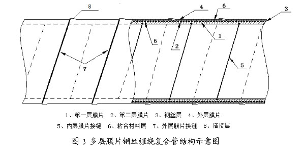 中等口径的中低压管道可由两层华体会huatihui(中国)同向螺旋缠绕热合而成,中间夹一层镀铜“过塑”高强度碳素弹簧钢丝,其拉伸强度可达1800MPa~2000MPa。每层华体会huatihui(中国)都先在特种设备上复合一薄层高强度粘合材料。复合管材时外层华体会huatihui(中国)的中线紧压在内层华体会huatihui(中国)的接缝上。内层华体会huatihui(中国)接缝在复合时先用焊枪焊接,外层华体会huatihui(中国)接缝则采用搭接方式连接。两层华体会huatihui(中国)敷胶面相向,连同钢丝大面积螺旋缠绕热压粘合,其粘合强度远超普通聚乙烯钢丝缠绕复合管。大口径管道则由3~4层华体会huatihui(中国)加钢丝复合。管材结构详见图3。